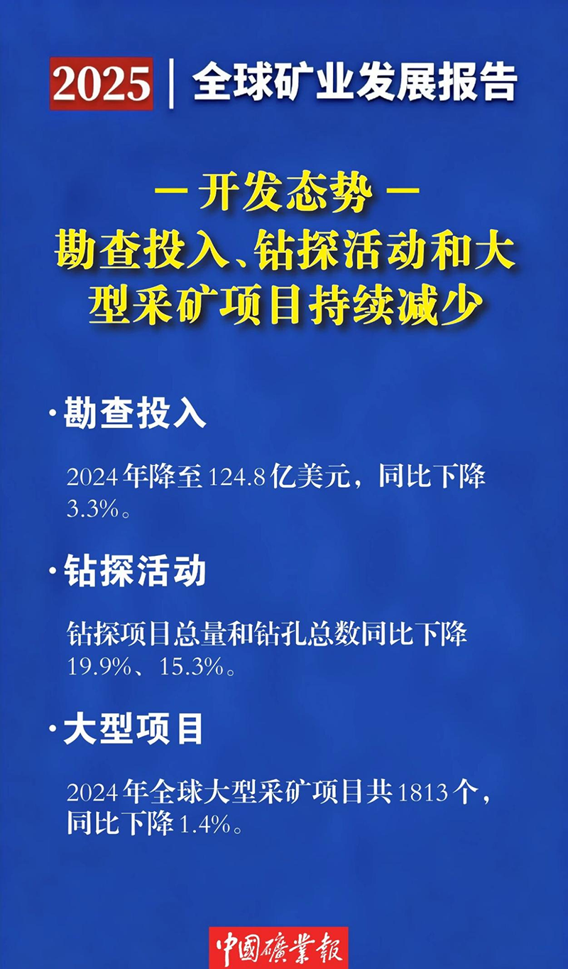 勘查開發方面,《報告》顯示,全球勘查投入、鉆探活動和大型采礦項目持續減少。2024年,全球主要固體礦產勘查投入124.8億美元,同比下降3.3%;鉆探項目總量和鉆孔總數同比分別下降19.9%15.3%;全球大型采礦項目共1813 個,同比下降1.4%